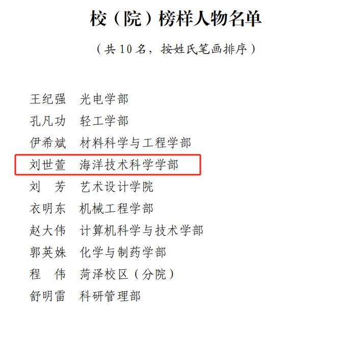 近日,齊魯工業大學(山東省科學院)黨委公布了在“高質量發展強擔當,改革創新當先鋒”黨員教育系列活動中遴選表彰的10名榜樣人物名單,海洋技術科學學部劉世萱同志成功入選。
