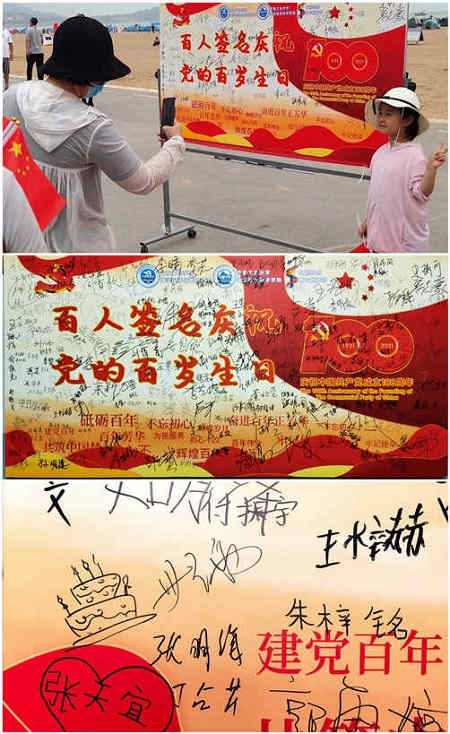在激昂的《沒有共產黨就沒有新中國》歌聲中,鮮艷的黨旗國旗在海風中高高飄揚,包含外國友人、少數民族、畢業生和老人、兒童在內的上百名游客群眾紛紛前來,在簽名欄上簽上自己的名字,還有人畫上生日蛋糕,為黨的百歲生日獻上真摯的祝福。