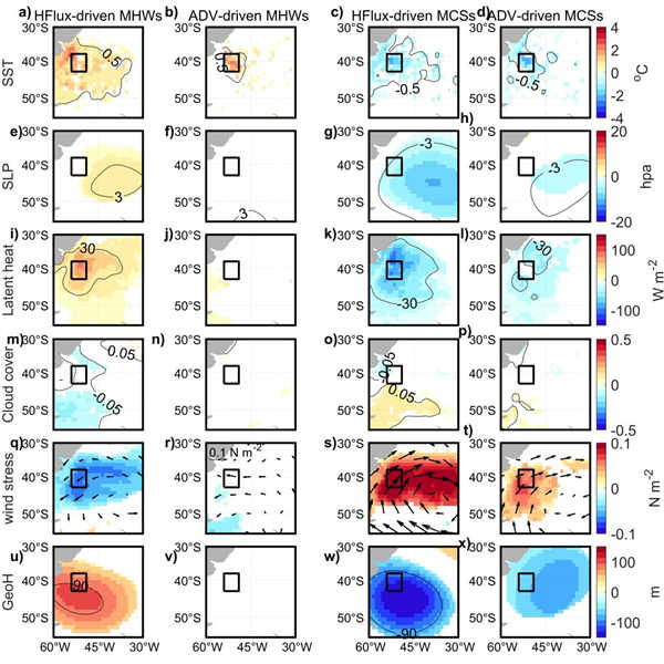 研究發現,熱浪和寒潮從空間分布和概率分布上都與渦旋強度有關(圖1)。在巴西暖流回流區,渦旋強度越大,熱浪發生的頻率越高,反之,渦旋強度越小,寒潮發生的頻率越高。海洋熱浪和寒潮最主要的驅動因素為平流(大尺度運動和渦旋運動)以及海氣熱通量。當海氣熱通量主導熱浪和寒潮的時候,海溫和大氣要素的變化水平覆蓋范圍很大,并在200hpa上空存在明顯信號;而當平流運動驅動熱浪或寒潮的時候,海溫和大氣要素的變化水平范圍小(圖2)。本項研究發現,海洋變量在極端事件的過程中協同性要弱于大氣變量。該成果的發現可為提高氣候模式預測能力以及推進與極端事件相關的三維海氣相互作用的認識提供理論支撐。