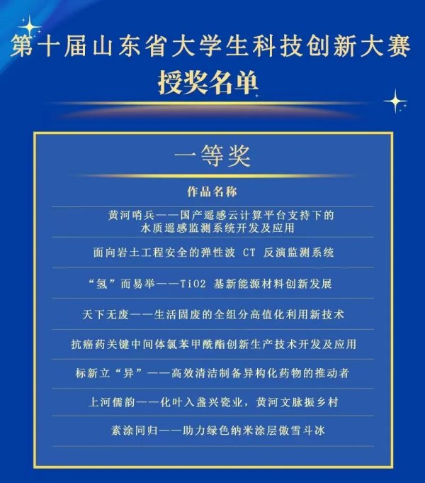 近日,山東省教育廳發布了《關于公布第十屆山東省大學生科技創新大賽獲獎名單的通知》,齊魯工業大學(山東省科學院)海洋技術科學學部的《黃河哨兵--國產遙感云計算平臺支持下的水質遙感監測系統開發及應用》項目獲一等獎,取得歷史最好成績。